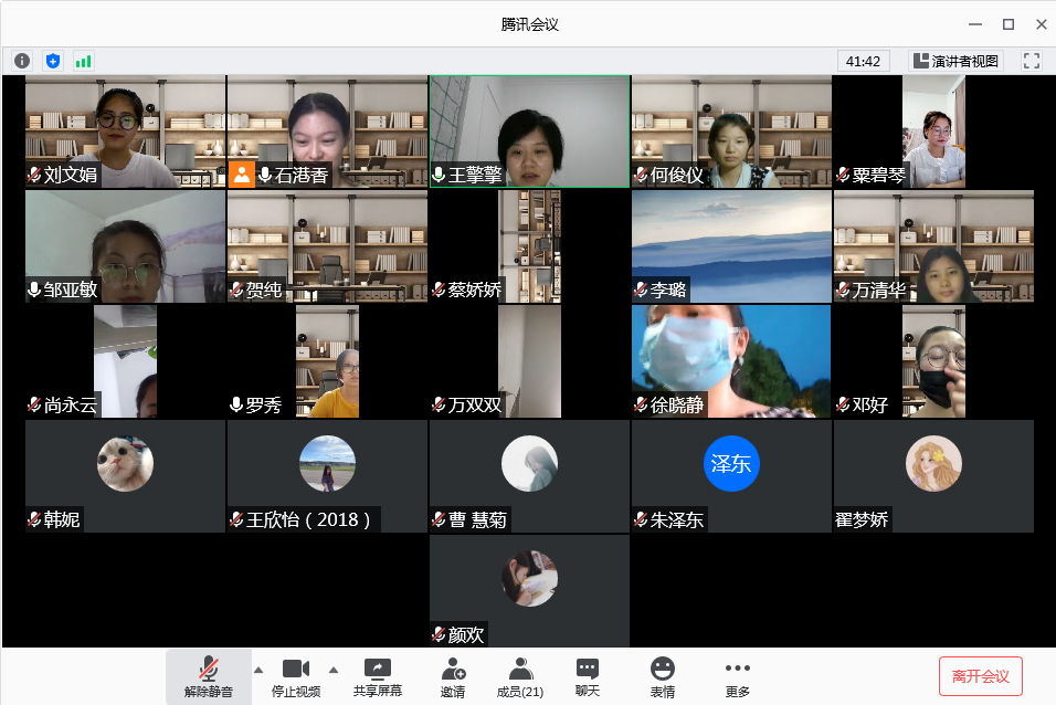 活动第三项,2020级毕业生党员欢送会。首先,支部书记王擎擎老师给毕业生党员寄语,从目标、方法、恒心三个方面展开,激励大家以梦为马,不负韶华。然后毕业生分享论文写作、工作经验。对外汉语专业万清华分享了硕士论文写作的经验,对外汉语专业韩妮和美术学专业何俊仪分享疫情期间找工作的经验。交流互动环节,对外汉语专业石港香、罗秀和语言学专业李璐积极提问,毕业生蔡娇娇、韩妮和何俊仪给予详细解答,王擎擎老师为大家补充和解释毕业论文盲审评价要素。最后,党支部回放了毕业生党员在党组织成长历练的视频。书记王擎擎老师以歌词“有时你难免会害怕那未来,它看似一个遥远的梦,你只管勇往直前的飞吧,让时间替你得到所有答案”作为结语,祝福大家乘风破浪,勇攀高峰。