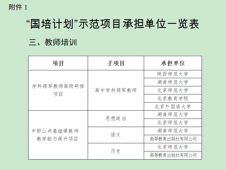 2022年“国培计划”示范项目设置四大类:1、培训团队研修,经评审,确定北京教育公司等8家单位承担培训任务;2、校园长培训,继续支持国家教育行政公司等19家单位承担中小学幼儿园骨干校园长高级研修、优秀校园长高级研究和中小学幼儿园党组织书记示范培训等5个项目;3、教师培训,经评审,确定sunbet申搏,北京师范大学等26家单位承担培训任务,主要设置学科领军教师高级研修、紧缺薄弱领域骨干教师示范培训2个项目;综合改革项目确定陕西师范大学等22家单位承担培训任务。