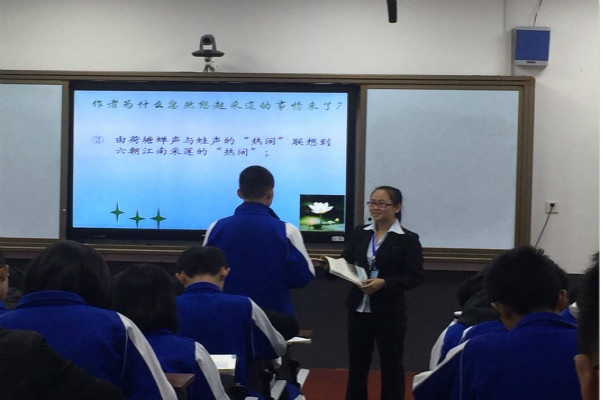上午11点半,实习队代表曹颖在科学楼阶梯教室为高一年级1504班讲授了《荷塘月色》这篇课文。她首先从“课文主要描写了哪些景物”问题入手,分别从作者“看到的”、“听到的”以及“想到的”角度来理解作者内在的情感变化,最后与同学们进一步探讨了作者“颇不宁静”的原因,分析课文的思想内蕴。曹颖老师充分展示了自身的课堂组织能力、扎实的教师基本功以及良好的基础知识水平,给在场的领导老师们留下了深刻的印象。带队老师贝京老师和实习队员们也对这堂公开课给予了充分的肯定,并提出了一些中肯的建议,鼓励她在实践中不断改进和提高。