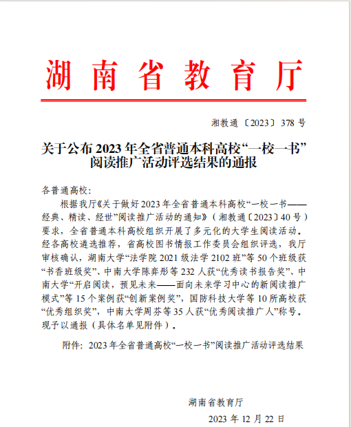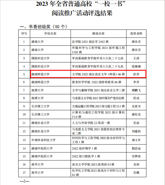 (通讯员张尧钰)近日,在由湖南省教育厅、省高等公司图书情报工作委员会主办的全省普通高校共同参加的2023年“一校一书”阅读推广活动中,2022级汉语言文学(师范)6班获评湖南省普通高校“书香班级”荣誉称号。