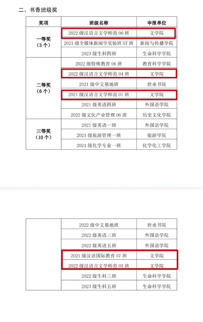 在此前举办的2023年度“一校一书”阅读推广活动中,2022级汉语言文学(师范)6班获得一等奖,2022级汉语言文学(师范)4班、2021级汉语言文学(师范)1班获得二等奖,2021级汉语国际教育7班、2022级汉语言文学(师范)5班获得三等奖。