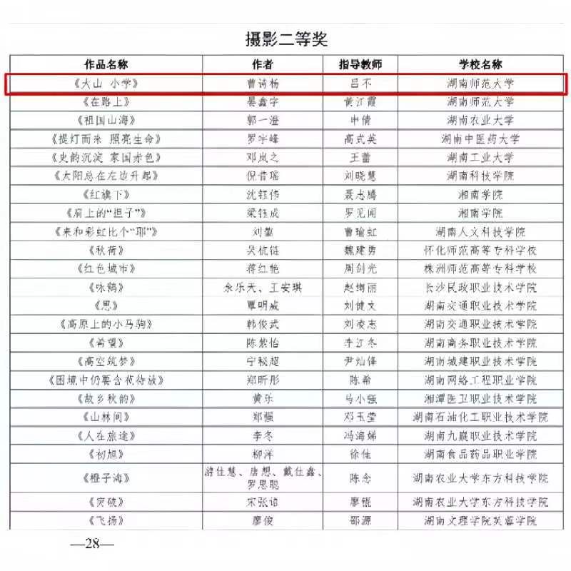 (通讯员谢璐怡)近日,湖南省教育厅发布《关于公布全省第七届老员工艺术展演活动评选结果的通知》,sunbet申搏共获奖3项。摄影类作品《大山 小学》获二等奖,设计类作品《新青年》获得二等奖,朗诵艺术节目《永远二十二岁》获得二等奖。