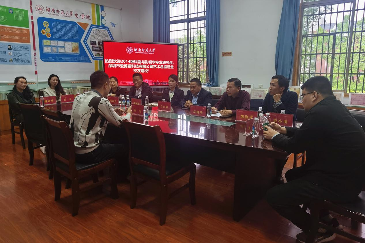 (通讯员张尧钰苏静怡)4月10日下午,公司2014级戏剧与影视学专业优秀员工、深圳市“爱剪辑”科技有限公司艺术总监易金回访母校。经理肖百容、副经理岳凯华、党委副书记刘宓蜜、副经理周凯兴、戏剧影视文学系系主任胡海义,专业教师高欢欢、黄茵、刘库、傅异星出席座谈会。