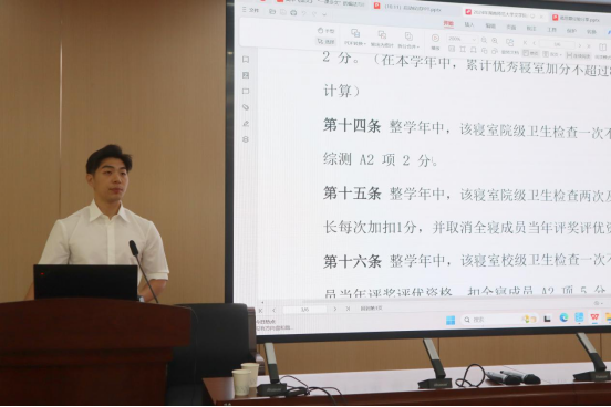 高明阳从志愿者招募机制、评分标准、抽查安排、公示流程及奖惩制度等方面对宿舍文明建设的政策文件进行解读。