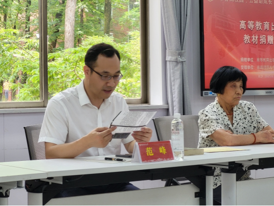 2025年6月27日下午3点在213室举行了高等教育出版社教材捐赠仪式。本次仪式藉由已故原中文系主任刘衍先生《中国散文史》出版之机,遗属易年英老师促成,高等教育出版社出版事业部编辑范峰、刘纯鹏、潘兵发起。公司党委书记熊剑峰、原党委书记李伶俐、副经理夏曙光、副处级专职组织员夏云飞、古代文学教研室老师向双霞、谢雨情出席。
