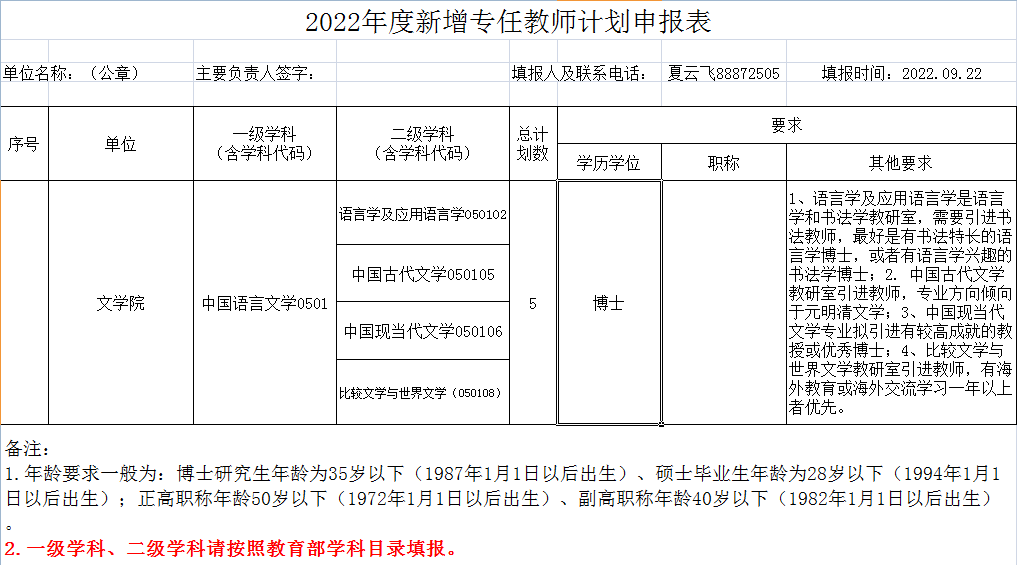 2022年度新增专任教师计划申报表