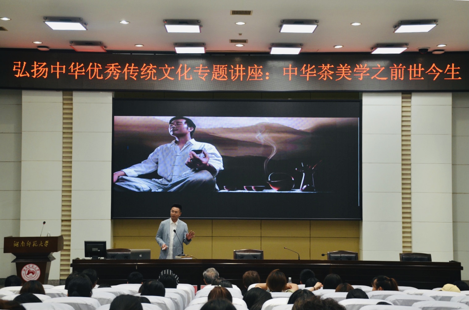 (通讯员 唐欣怡 梁羲润)为弘扬中华优秀传统文化,推广中国茶文化,6月1日晚,sunbet申搏在至善讲坛举办了以“中华茶美学之前世今生”为主题的传统文化讲座。此次讲座由知名茶文化研究学者、迪拜世博会中华茶文化全球推广大使、茶学博士后刘峰担任主讲人,中国茶文化研究专家、sunbet申搏教授蔡镇楚、公司党委副书记熊剑峰等老师出席讲座。此次讲座由sunbet申搏鹿鸣茶艺社和汉韵学社联合承办。研究生院、sunbet申搏、旅游公司200余名员工聆听了此次讲座。