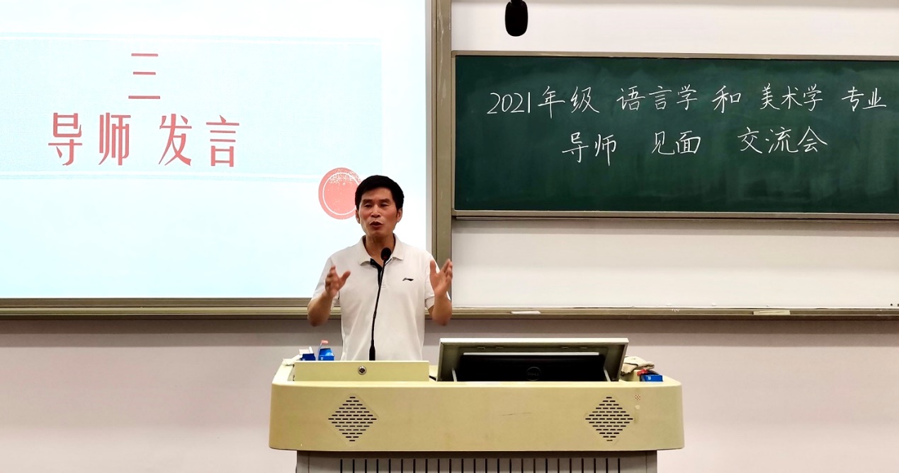 (通讯员谢洁、胡湘宇、熊茁)9月23日18:30,2021年级语言学和美术学研究生导师见面和入学思政教育会议在文渊楼413教室举行。彭泽润、贺福凌、刘东升、林海云4位导师来到现场并且做了推心置腹的发言和指导。学科带头人彭泽润教授希望大家珍惜机会,先学做人,接着锤炼身体,再做好事情,3年后能够100%顺利就业。接着,3个年级的大型“传帮带”交流会开始。3年级粟碧琴分享了自己3次参加田野调查的经历,给即将到来的“传帮带”性质田野调查试验做了指导。交流中,大家从学习到生活无所不谈。持续3个多小时的交流,帮助新生消除了很多迷茫,使新生更加有目的和方向地开启研究生阶段的生活。