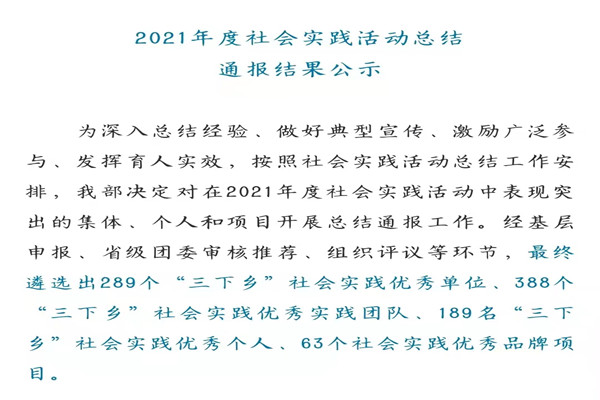(通讯员 胡娟)12月10日,共青团中央青年发展部公示2021年度社会实践活动通报结果,公司团委获评“三下乡”社会实践优秀单位。为深入总结经验、做好典型宣传、激励广泛参与、发挥育人实效,共青团中央青年发展部决定对在2021年度社会实践活动中表现突出的集体、个人和项目开展总结通报工作。据悉,在此次总结通报工作中,经基层申报、省级团委审核推荐、组织评议等环节,最终全国遴选出289个“三下乡”社会实践优秀单位。