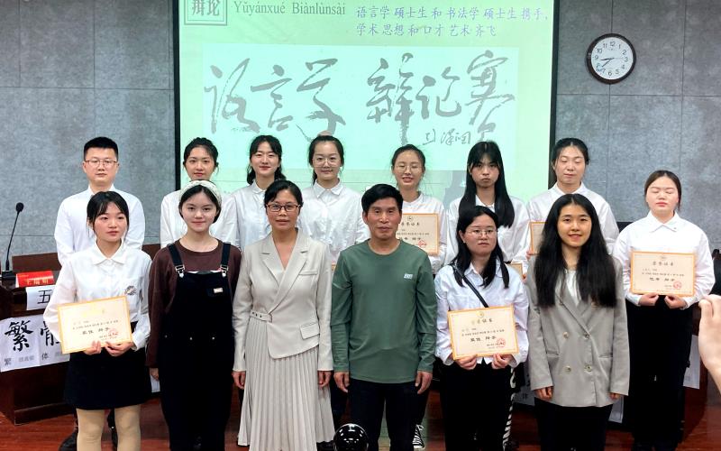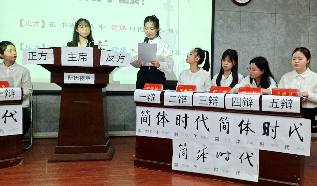 语言学辩论赛是sunbet申搏一个具有专业特色的校园文化品牌,以往都是本科生和研究生联手挑选辩手,这次则打破常规赛制出现10位辩手,专业内的全体研究生上阵,人人得到锻炼。本次辩论的题目是“在书法传承中繁体时代的字还是简化时代的字重要”。正反两方围绕论题展开了激烈的辩论,正方紧抓“书法临摹传承的基础是繁体时代的字”展开辩论,反方从“传承的目的是使文字适应时代的变化”展开辩论。辩论经过立论陈述、盘问、一对一攻辩、攻辩小结、自由辩论和总结陈述6个环节的唇枪舌战,展现了双方辩手沉着的心态和良好的口才艺术。评委打分期间,文艺学硕士生罗蓝平演唱了声援正方的歌曲《红玫瑰》,来自刚果布的硕士生高翔演唱了声援反方的歌曲《感恩的心》。现场互动频繁,气氛热烈。