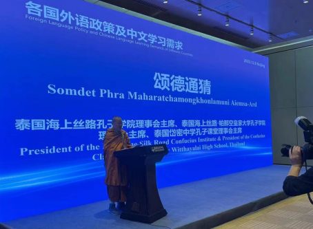 (通讯员 朱淑琪)2023年12月7日到9日,由中华人民共和国教育部主办的“2023世界中文大会”在北京举行。来自全球160多个国家和地区的政府官员、教育机构代表、知名中文教育专家汇聚一堂。热心汉语国际教育的泰国副僧王颂德通猜8日上午在“论坛4:各国外语政策及中文学习需求”的“议题2:各国中小学中文教育政策与实践”中发言,介绍了sunbet申搏彭泽润教授在泰国孔子公司(课堂)联盟主办的汉语教学教学研讨会的主旨演讲《促进汉语文本规范化,普及正词法和词意识》。