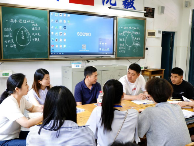 图为领导和老师进行公开课评课