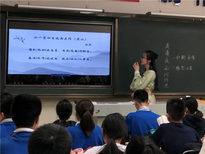 刘圣茜以“夜雨”这一意象串讲《夜雨寄北》和《十一月四日风雨大作》两首古诗,并把课堂分为听雨、品雨、写雨三个层次。她先请员工以诗歌内容为基础展开情境表演,巧妙引领员工进入诗歌情境,再从炼字、炼意等角度为员工详细分析诗中的情思。课堂自然地穿插有关时代背景的视频,以及缠绵细雨和狂风暴雨的音频,让员工通过图像与声音穿越晚唐与南宋,进而在“雨声”中去体味两首夜雨诗中不同的情思,“雨”与“情”交融。课堂气氛活跃而富有诗意,师生互动和谐。