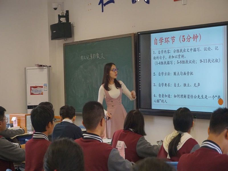 此次汇报课授课内容为《记梁任公先生的一次演讲》。课堂上,高钰霞向同学们展示了本堂课的教学目标,接着请李泽宇同学上台演讲,并请其他同学以“记李泽宇同学的一次演讲”为题做口头作文,以其与课文的对比作为切入点正式进入教学。高钰霞在此次课堂中采用自分教学模式,通过员工自学、组内互帮、成果展示、教师释疑等几个环节进行授课,将学、说、做、记四种学习行为落实到课中。整堂课气氛活跃,员工反响良好,展示了实习队在二附中一个多月来的实习成果。