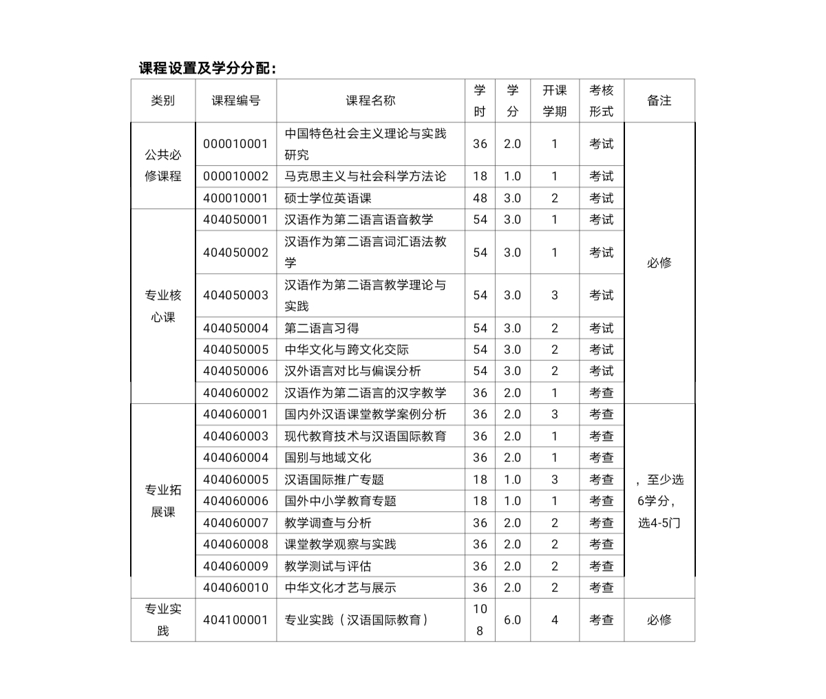 学制3年,每年两个学期。前三个学期集中完成各门课程的学习,后三个学期到国外或在国内从事汉语教学等专业实践,并结合专业实践,在导师指导下撰写学位论文。