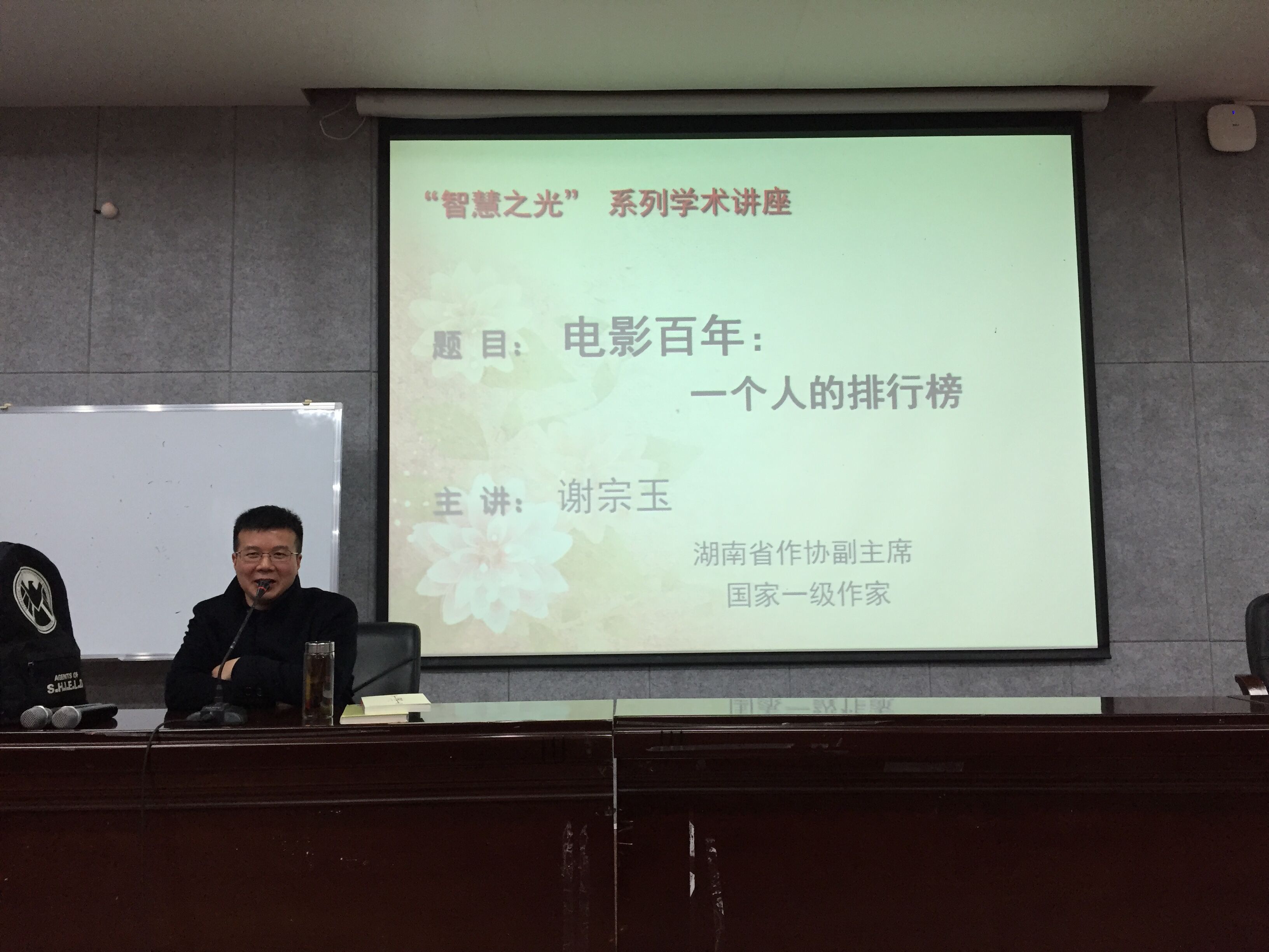 (通讯员 谭霁 杨艾菁)为培养研究生艺术鉴赏能力,提升文学素养,3月16日下午,公司于217教室举行了题为“电影百年:一个人的排行榜”智慧之光专题讲座。湖南省作协副主席、一级作家谢宗玉担任主讲。