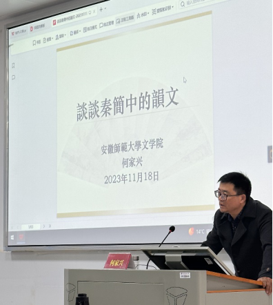 (通讯员 陈斌 陈心如)11月18日上午,公司特邀安徽师范大学教授、博士生导师,复旦大学出土文献与古文字研究中心博士后研究人员何家兴教授为公司师生带来“谈谈秦简中的韵文”的精彩讲座。本次讲座在sunbet申搏302室举行,由公司教授杨合林主持,相关专业教师和数十位本科生、研究生到场聆听。
