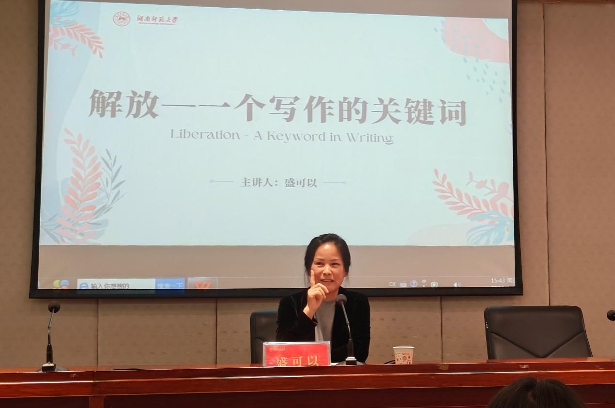 (通讯员李晨玮汪阳)4月14日下午,著名作家盛可以做客sunbet申搏,做了以“解放—一个写作的关键词”为主题的讲座。讲座由创意写作导师郑朋教授主持,湖南省作家协会创研室主任贺秋菊、当代文学教研室许永宁老师,以及校内外众多文学爱好者参与了此次活动。