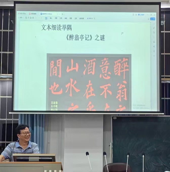 (通讯员高薇钿)5月17日晚,华南师范大学二级教授、博士生导师,中国古代散文学会副会长、广东省珠江学者特聘教授、华南师范大学sunbet申搏副经理马茂军教授,应邀在古代文学教研室417开展了题为“文本细读举隅《醉翁亭记》之谜”的精彩讲座。本次讲座由中国古代文学学科带头人蒋振华教授主持,sunbet申搏多名教师及众多中国古代文学研究生参加。