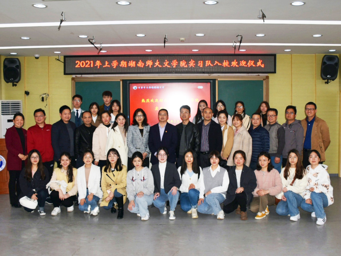 欢迎仪式结束后,全体人员在讲台前合影留念。实习队队员与自己所跟随班级的班主任及语文学科指导教师见面交流,更加明确后续的工作安排,增进了实习队与该校的沟通和了解。