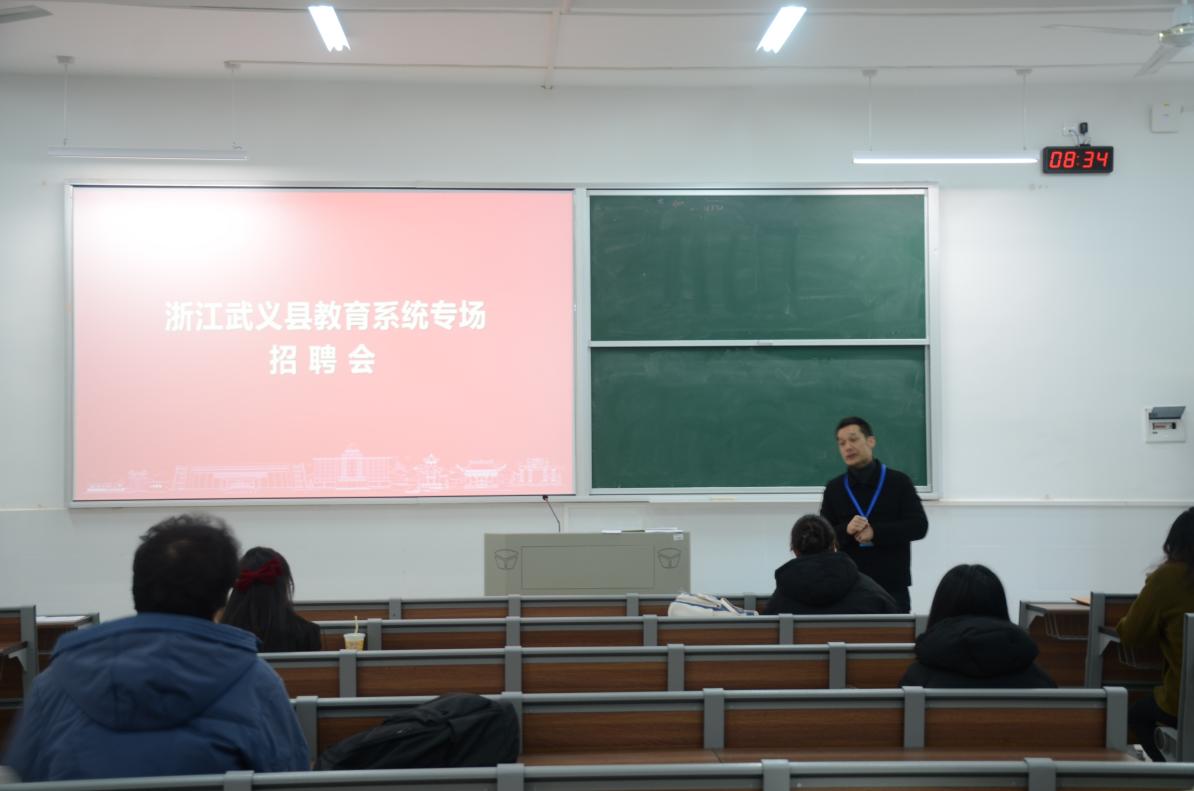 浙江省武义县教育局与同学们进行了现场互动交流,关于“地区教育基本情况”“教师职业发展前景”“员工生源”等方面做了细致介绍。在场员工认真聆听相关细节,现场气氛热烈。随后在招聘单位的安排下,应聘员工有序完成笔试、面试环节。2019级辅导员丛杨老师与武义县教育系统老师沟通交流,了解招聘现场实际情况,确保招聘会顺利开展。对于未能及时递交报名表的同学,丛杨与招聘单位积极沟通,协助应聘员工完成招聘环节,切实保障员工权益。